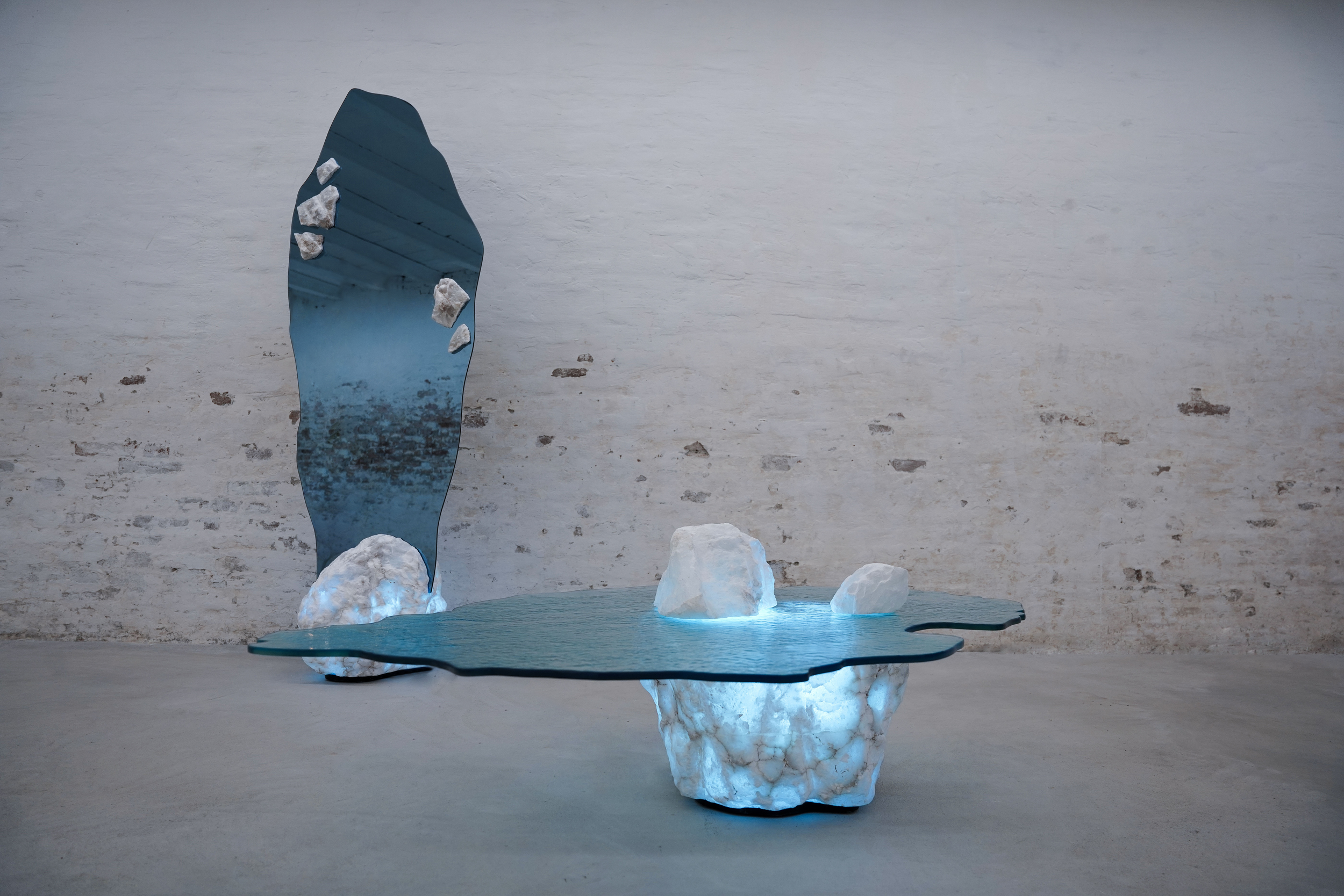 Volterra alabaster and glass. Glacial objects where light rises from within. Proportion, Tuscan craft, longevity.