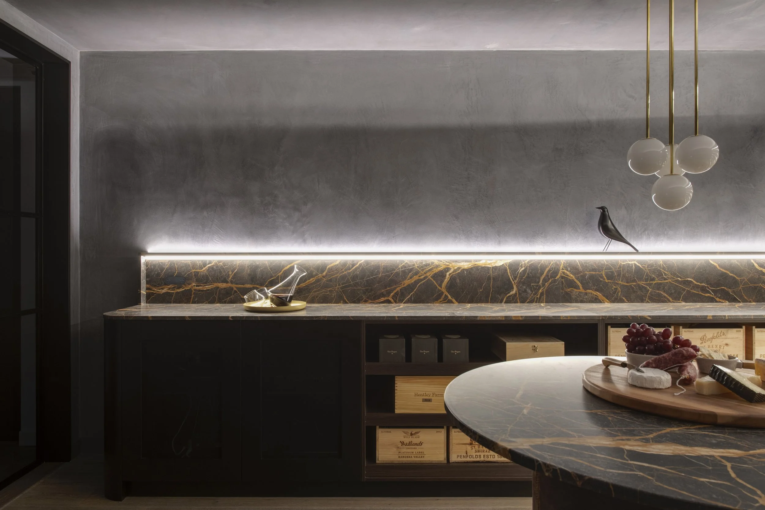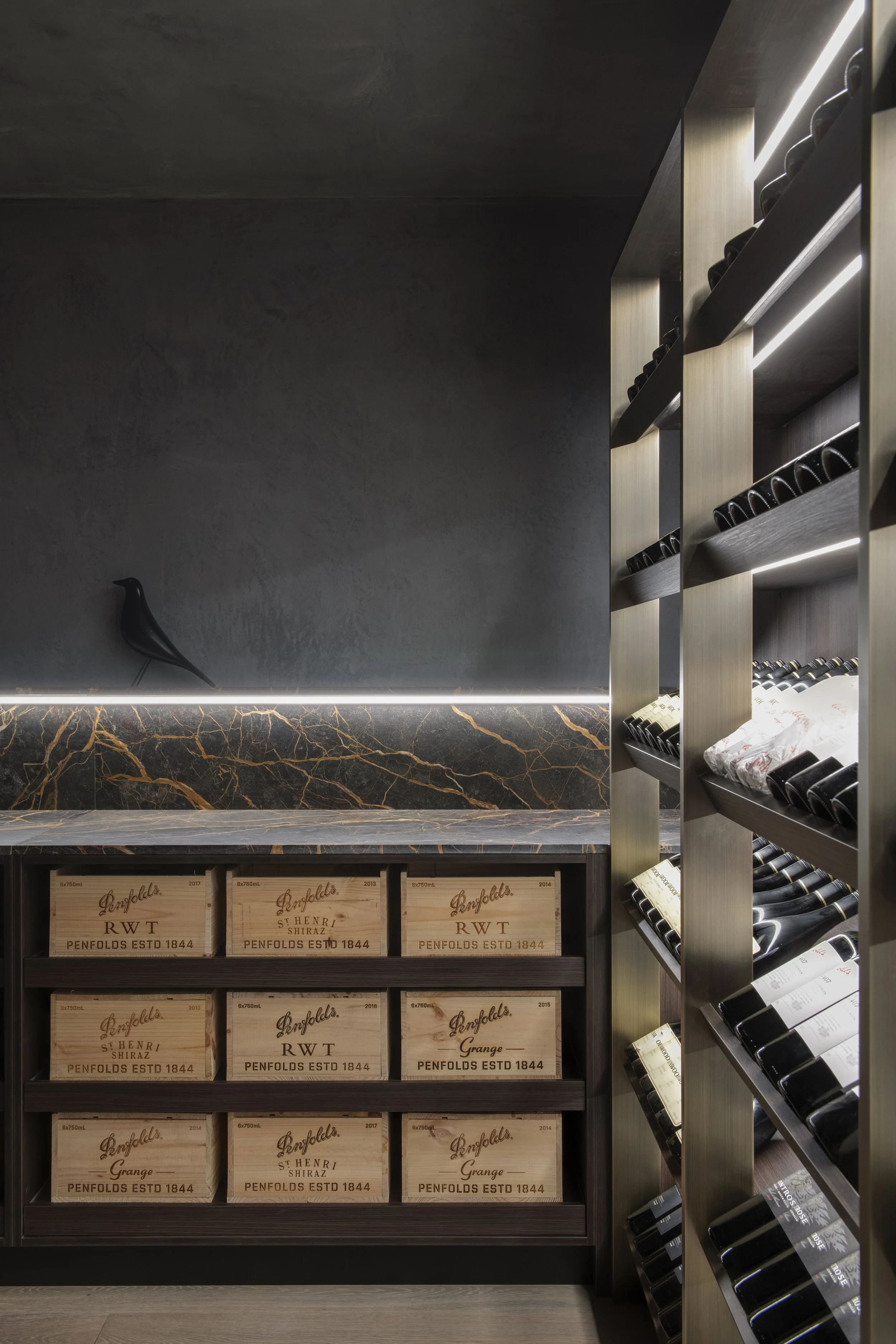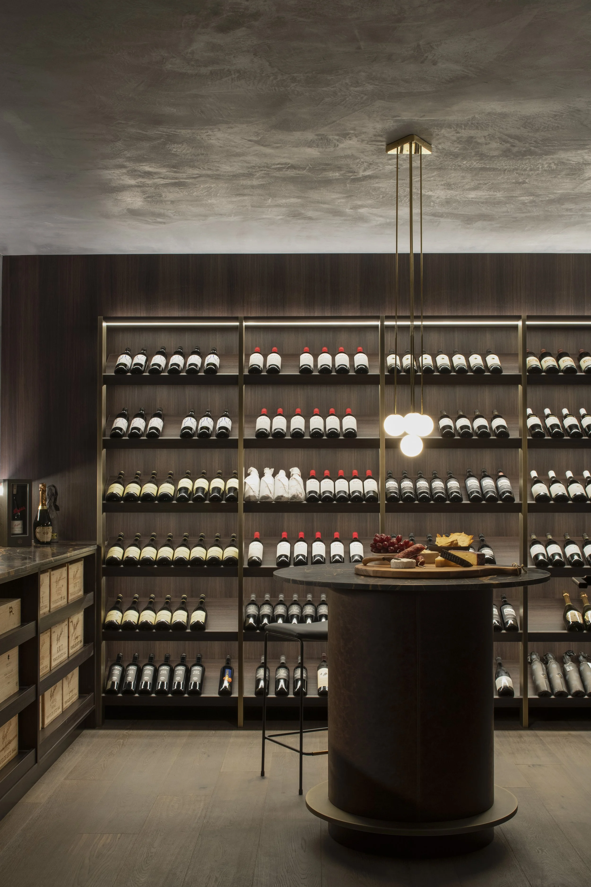 Surfaces are chosen for their performance as much as their beauty. Robust finishes line the walls and shelving, balancing the need for durability with a refined, residential character. The colour palette is deliberately subdued so the bottles, and the ritual around them, become the focal point.