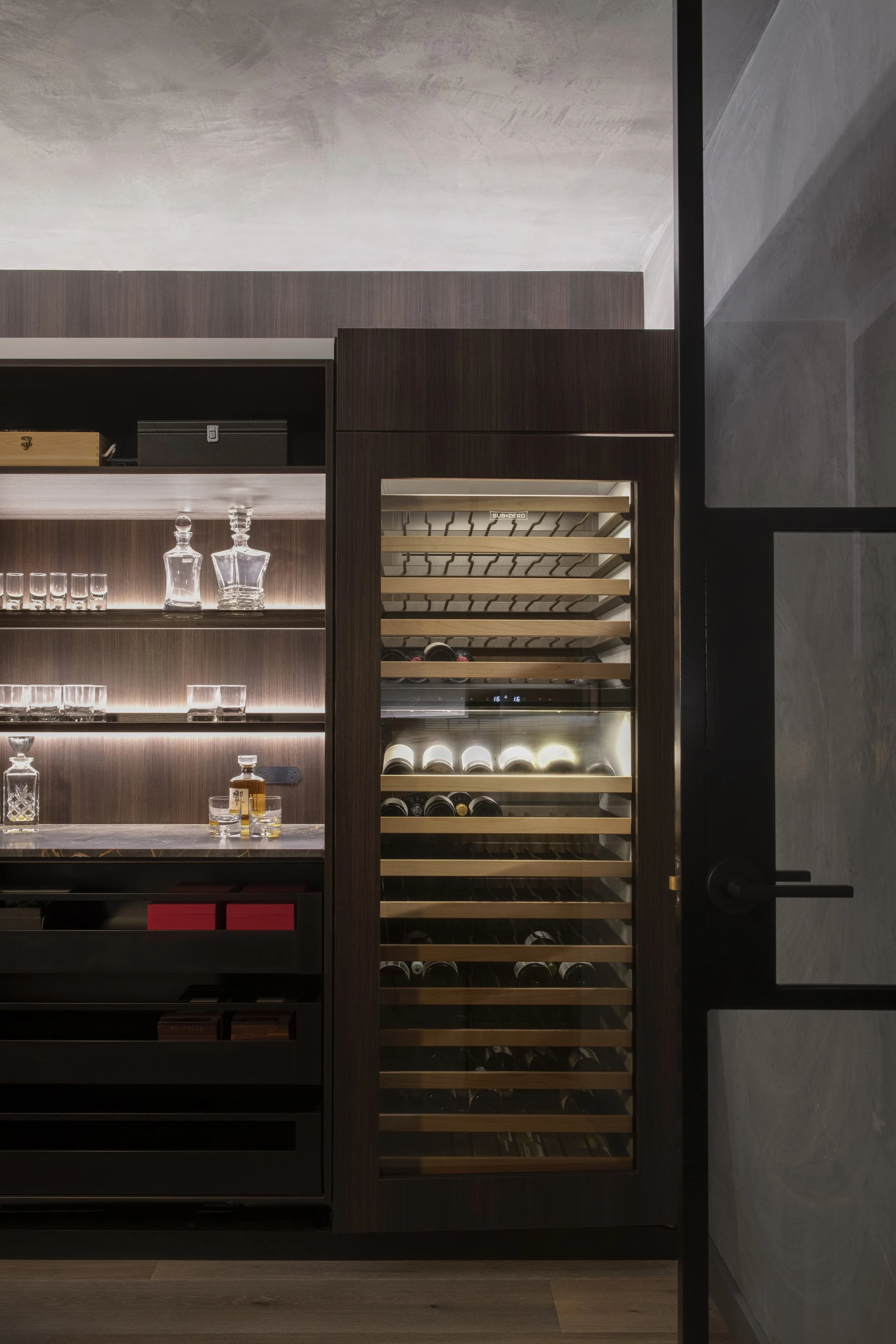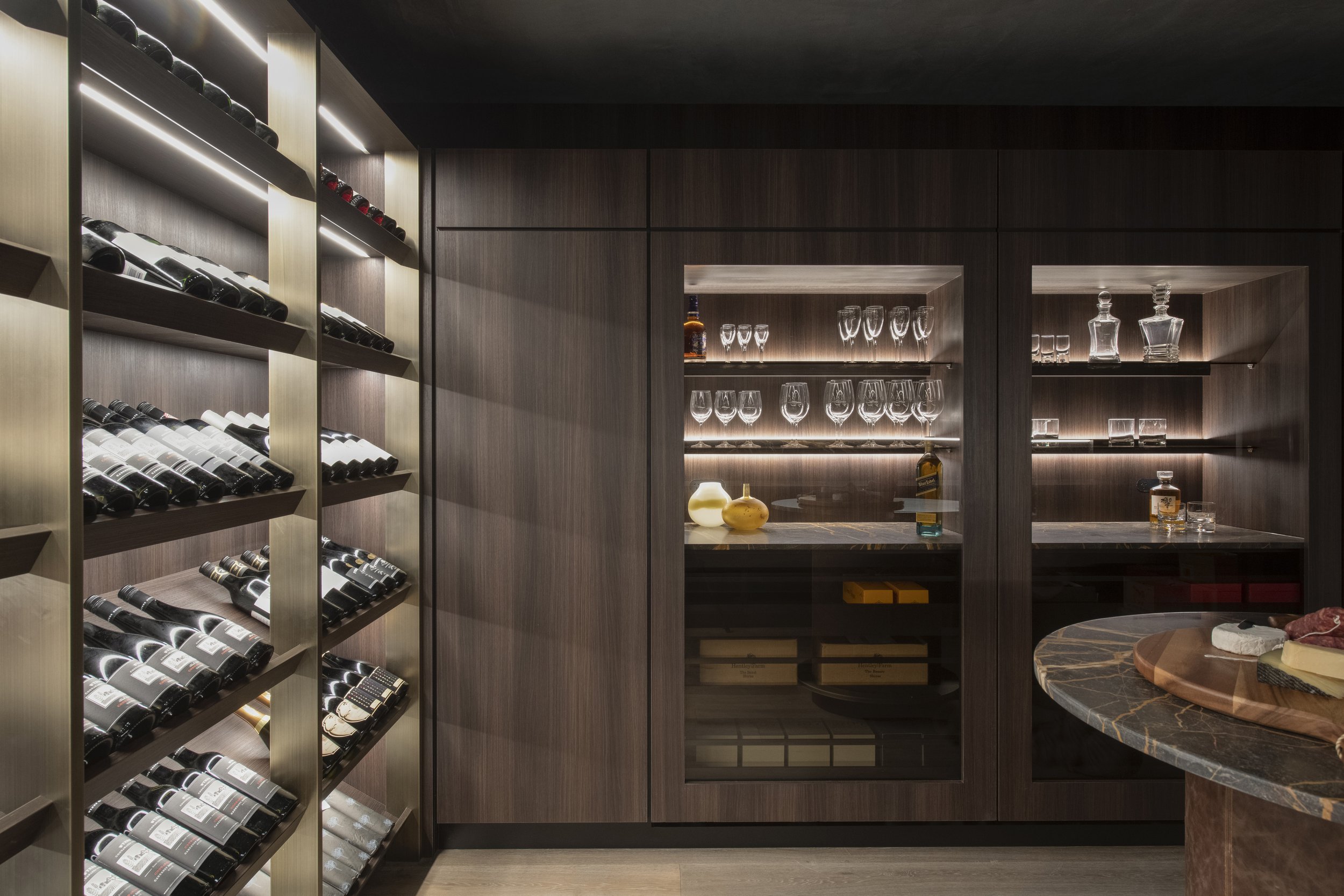 Under soft, indirect lighting, labels glow without being exposed to harsh brightness. The room feels cocooned, yet never claustrophobic - a careful orchestration of contrast between dark and light, solid and transparent.