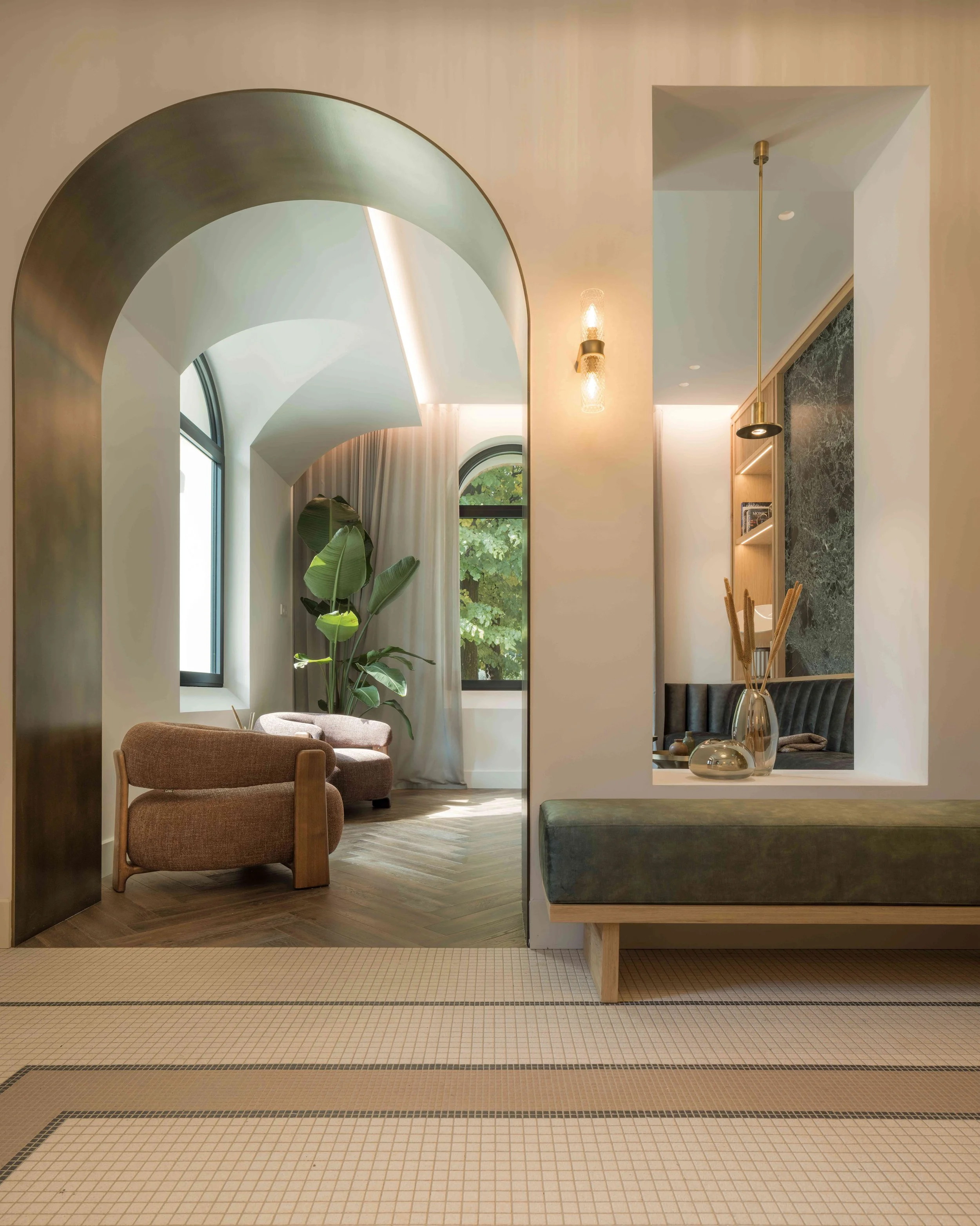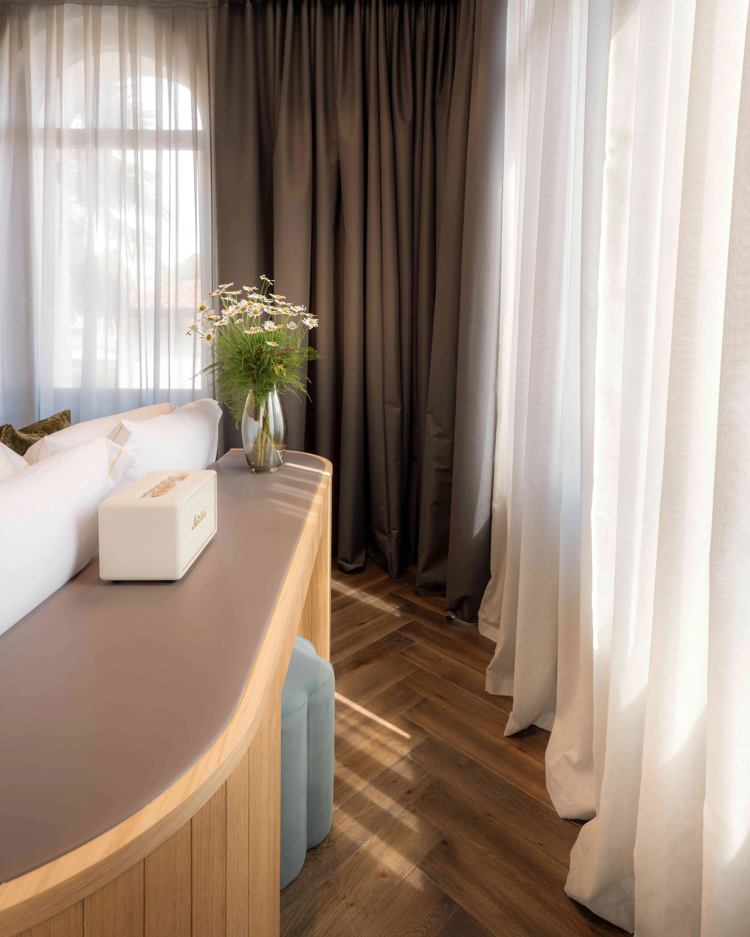 The rooms follow a poetic idea: each is inspired by a Greek divinity and aligned with the path of daylight throughout the day, turning time itself into atmosphere.
