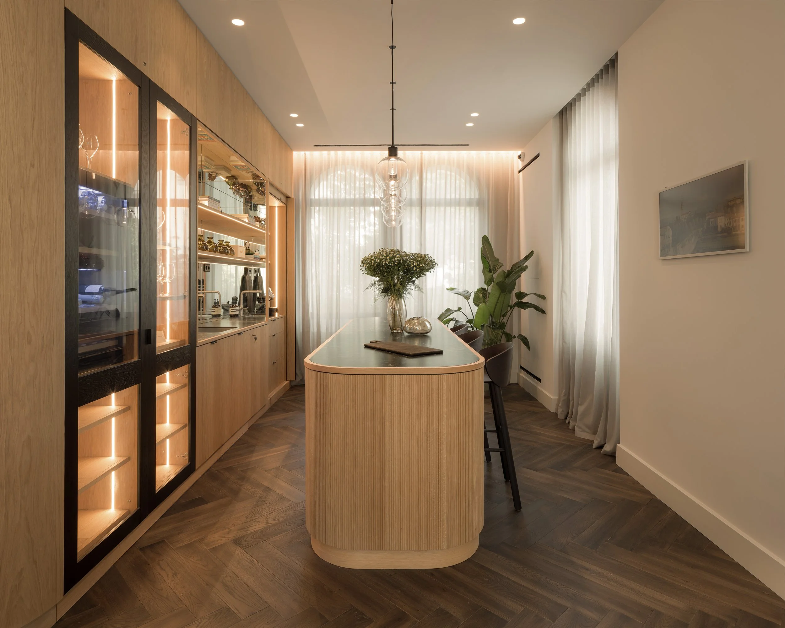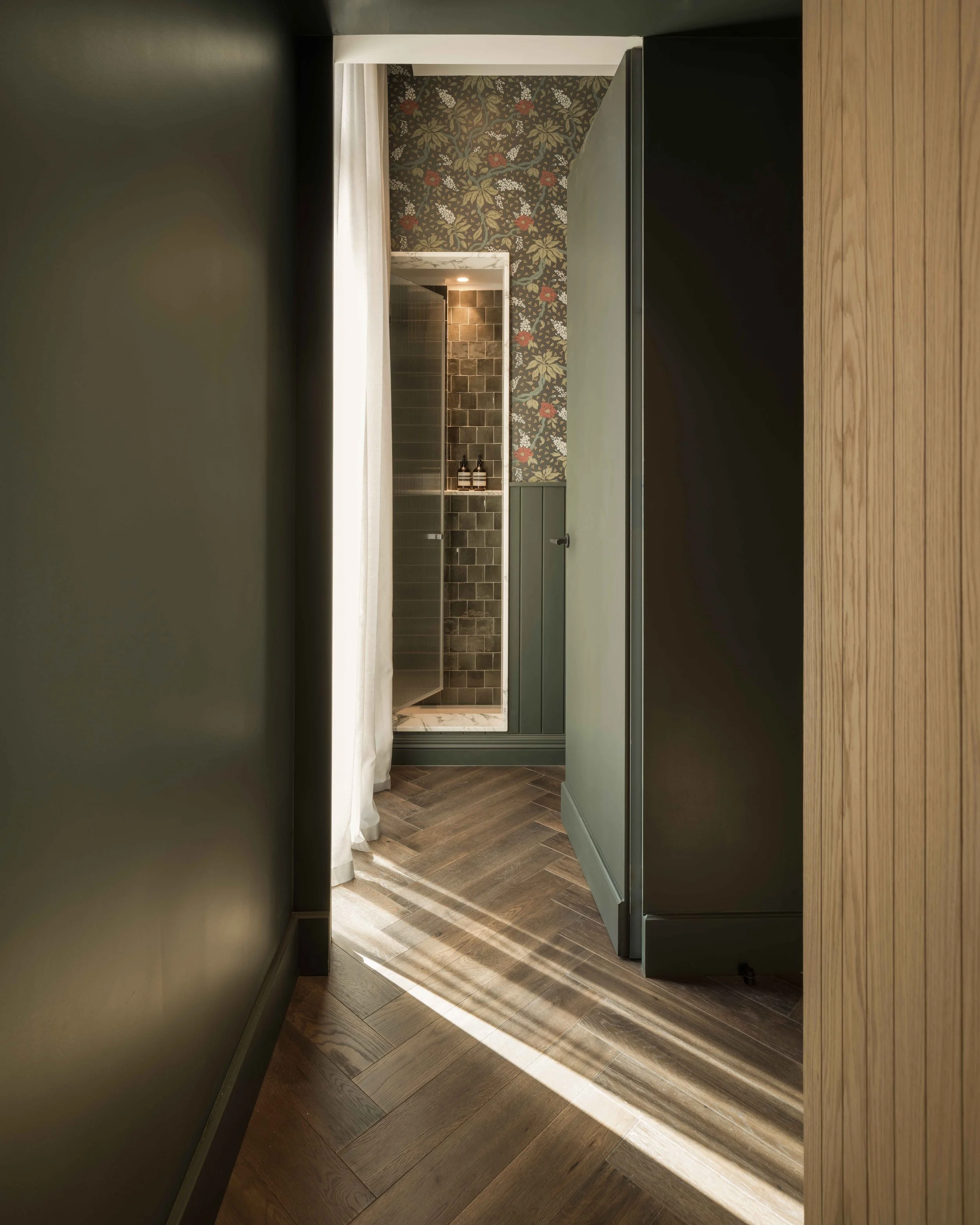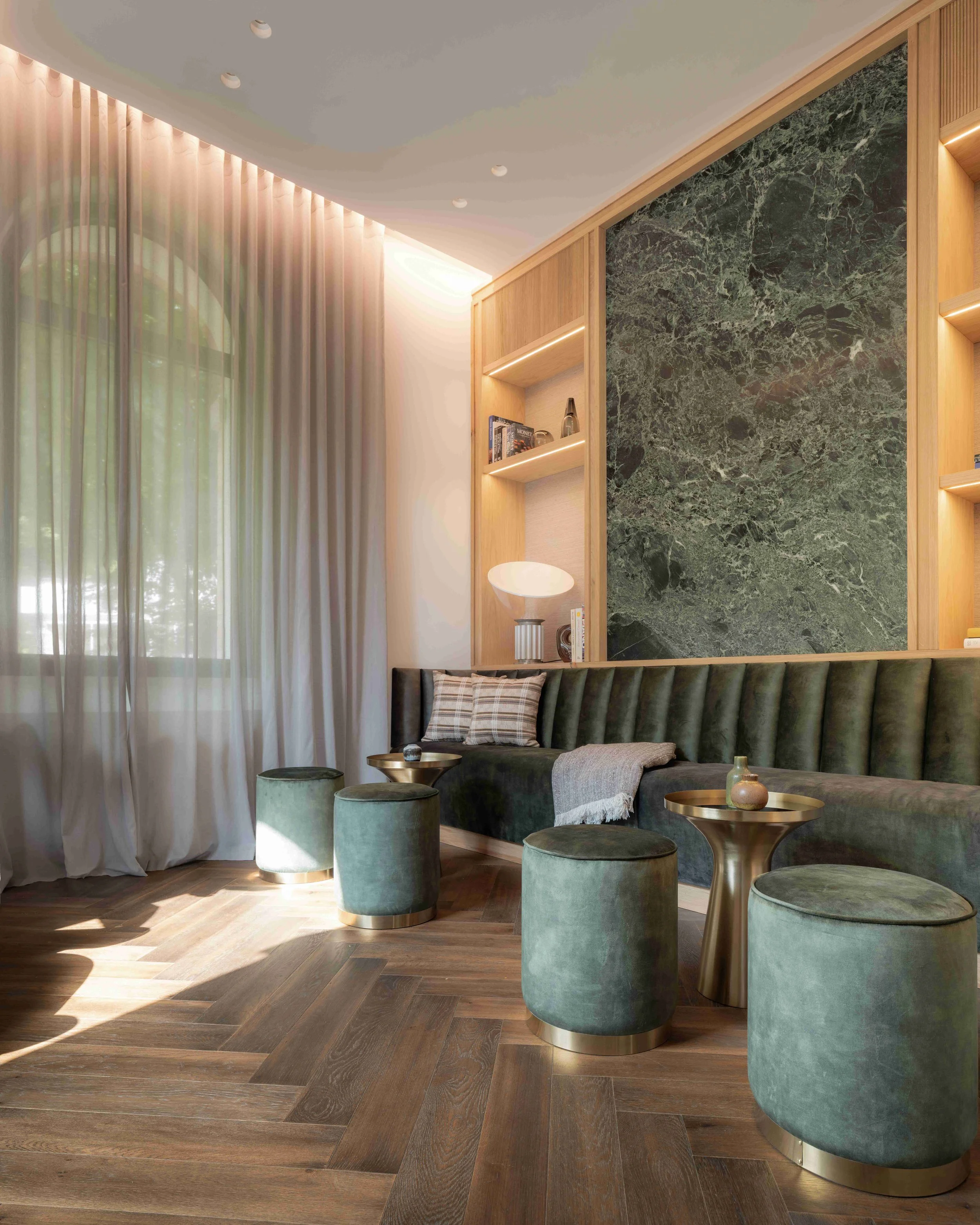 Natural and dark oak define walls and custom furniture. Marble surfaces such as Verde Alpi appear in key areas, while satin brass lighting becomes almost sculptural. Each space is conceived as a different chapter—chromatically and materially—yet connected through a continuous sensory experience.