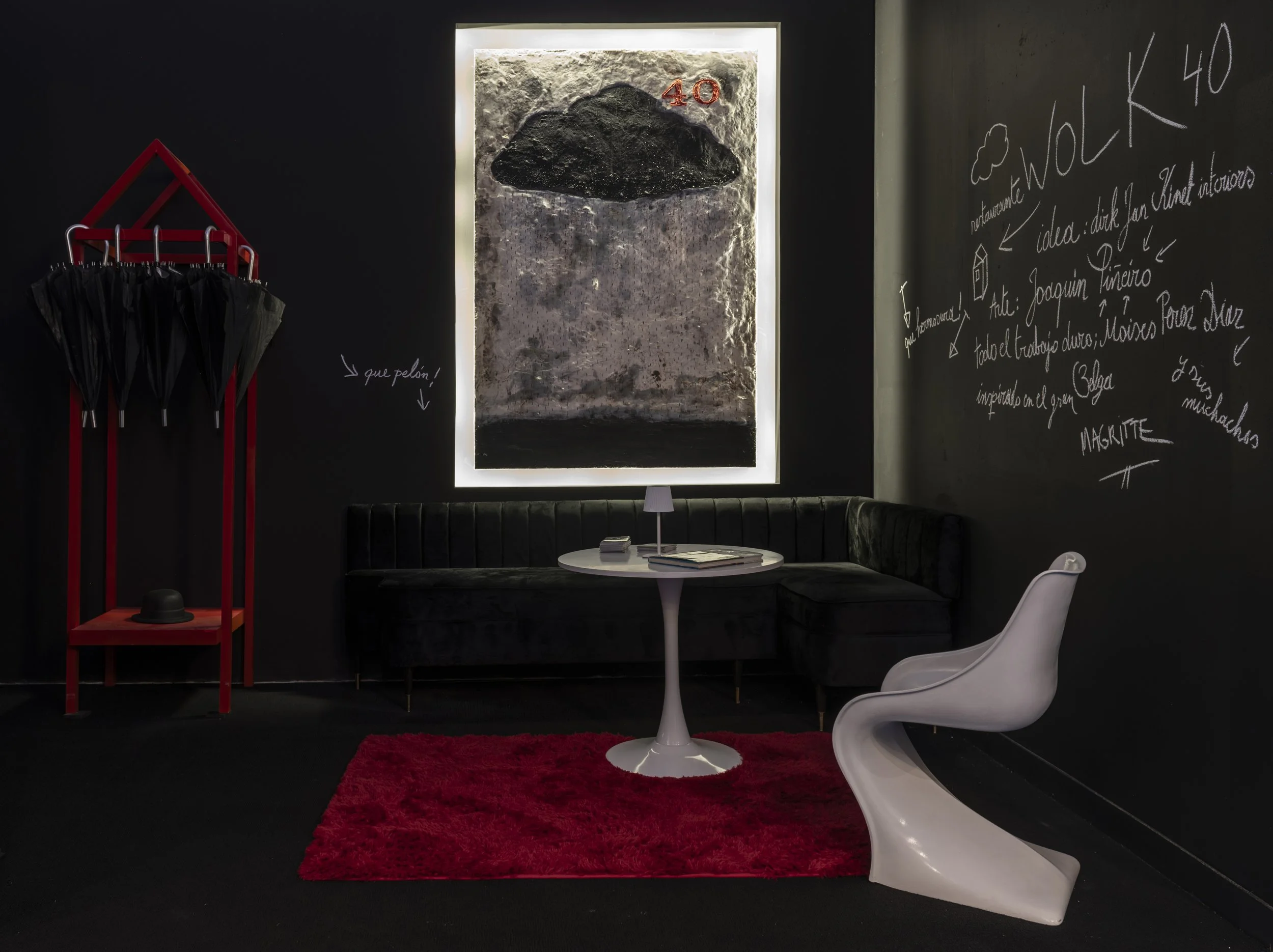 La decoración, que refuerza esta atmósfera de misterio, está enriquecida por las obras monumentales del artista Joaquín Piñeiro, quien emplea tonos grises y marrones, así como texturas ruidosas que evocan la sensación de tormentas. Así, Wolk 40 se convierte en un espacio donde cada detalle está pensado para maximizar la inmersión en esta experiencia sensorial única.