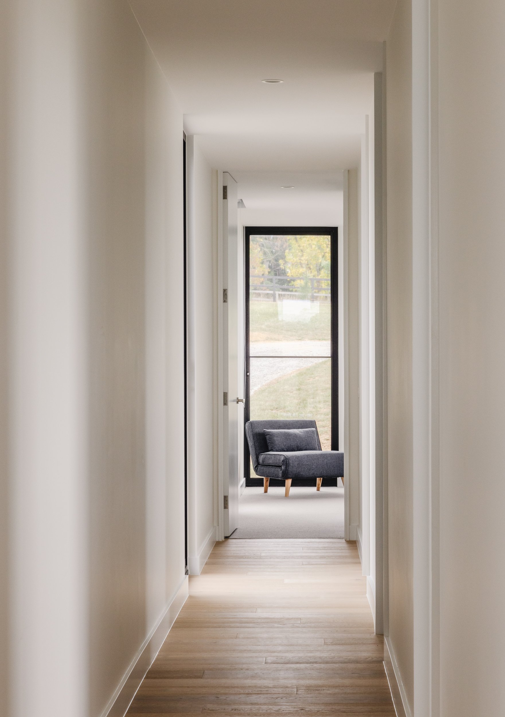 While the house reads as a single, unified object, it was fabricated off-site in precision-built modules. This approach shortened construction time on the rural property, reduced site disturbance and material waste, and allowed for a high level of finish and detailing before the home even arrived on the land.