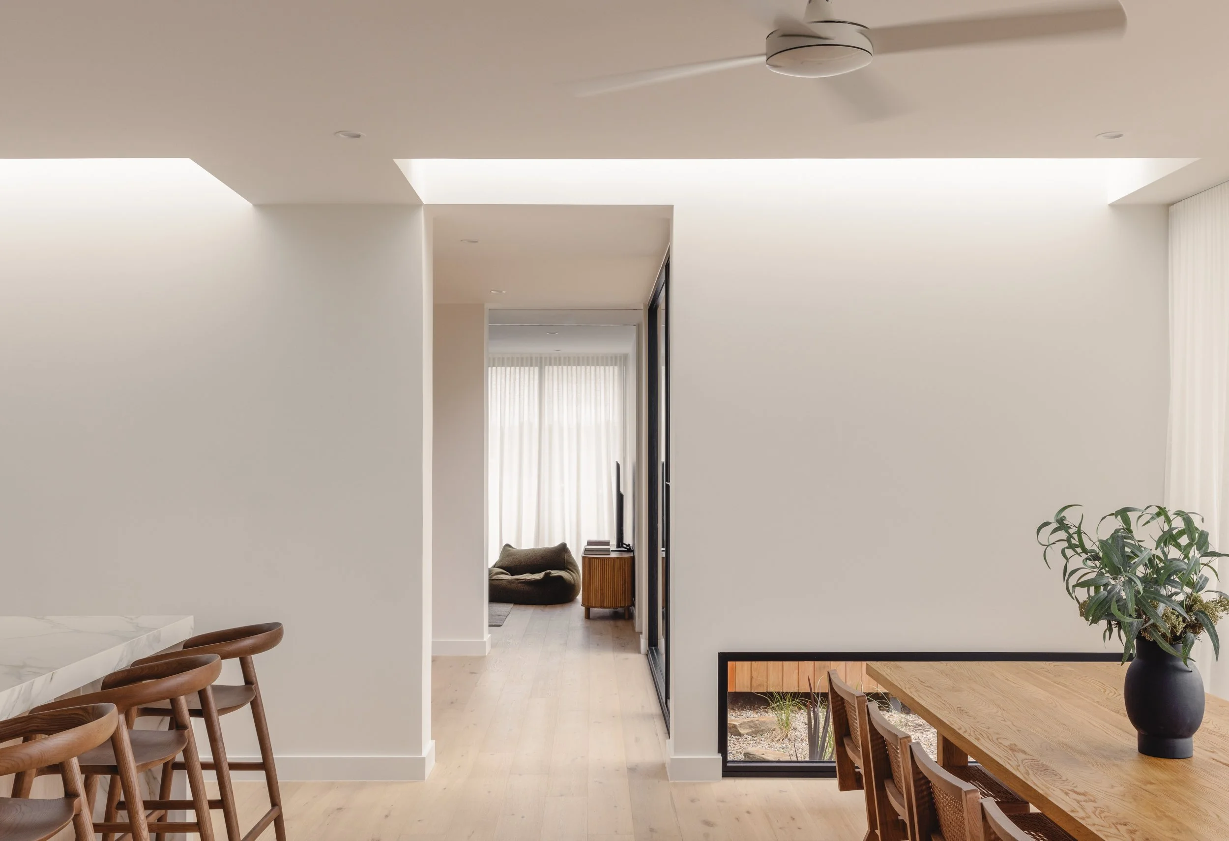 Set on generous acreage, the house draws from the historic manor houses that define Burradoo’s character. Instead of copying period details, the architects extract a single, powerful gesture: the pitched roof. Here, it becomes a clean, contemporary silhouette—stretched, edited and recomposed to frame views, hold light, and anchor the home in its pastoral setting.