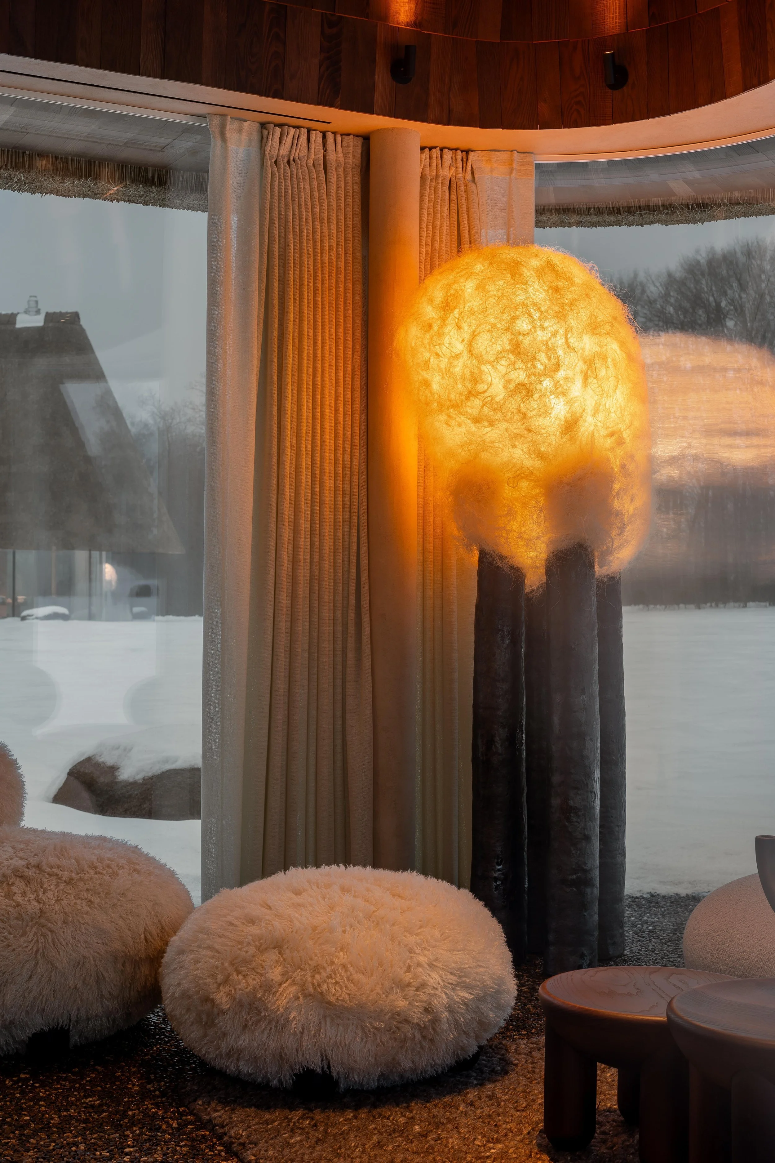 There is deliberately no television. Instead, guests are invited to watch live fire through the circular opening of the fireplace, or simply follow the changes of light across the landscape. The idea is subtle but clear: informational detox as hospitality, and time for emotional restoration.