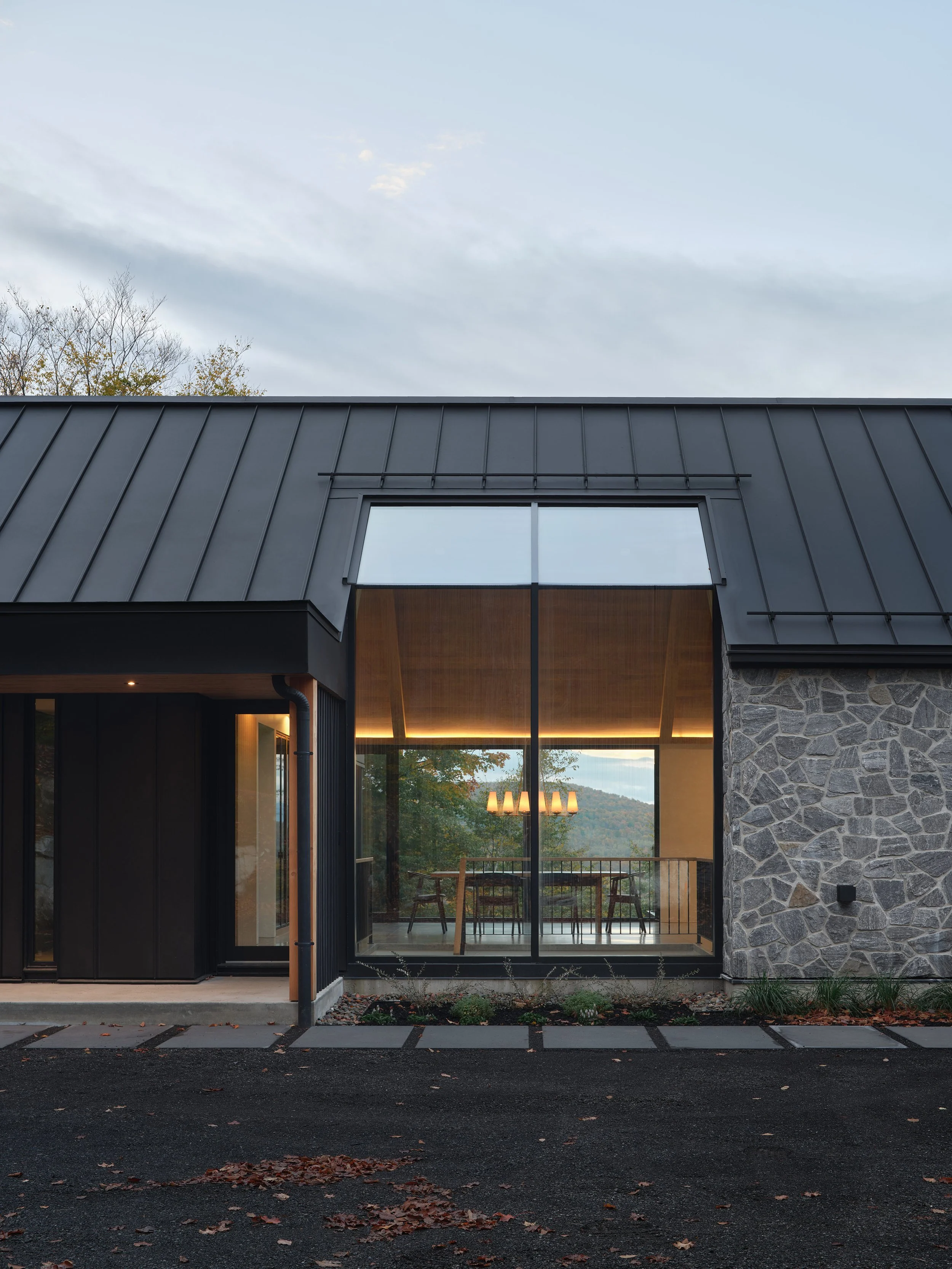 Inside, daylight floods through vertical glazed openings and skylights, illuminating the cathedral-like main space where the living room, dining room, and kitchen merge into a single linear volume. A stone fireplace serves as the heart of the home, extending the interior onto a covered terrace for year-round enjoyment of the outdoors.
