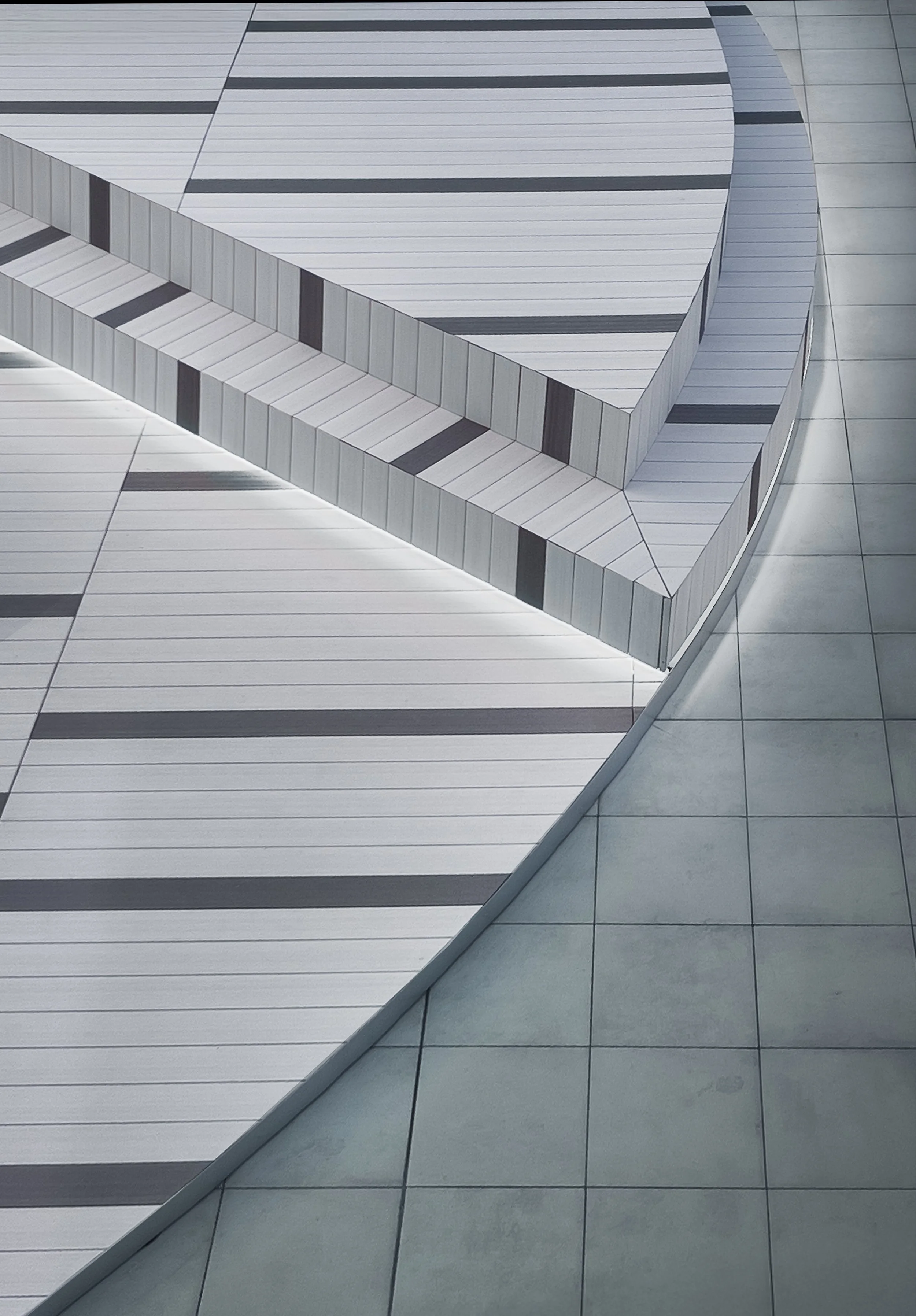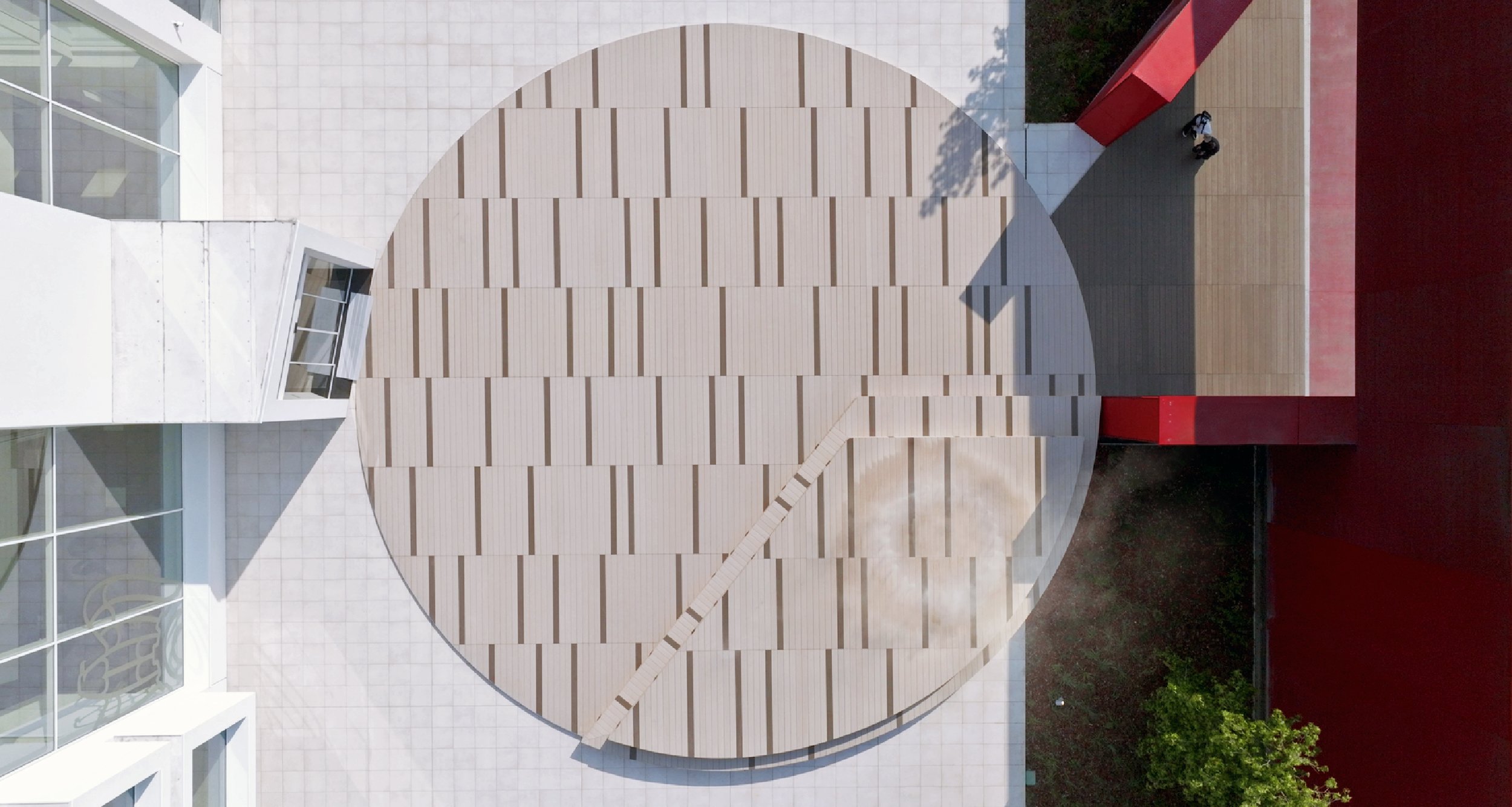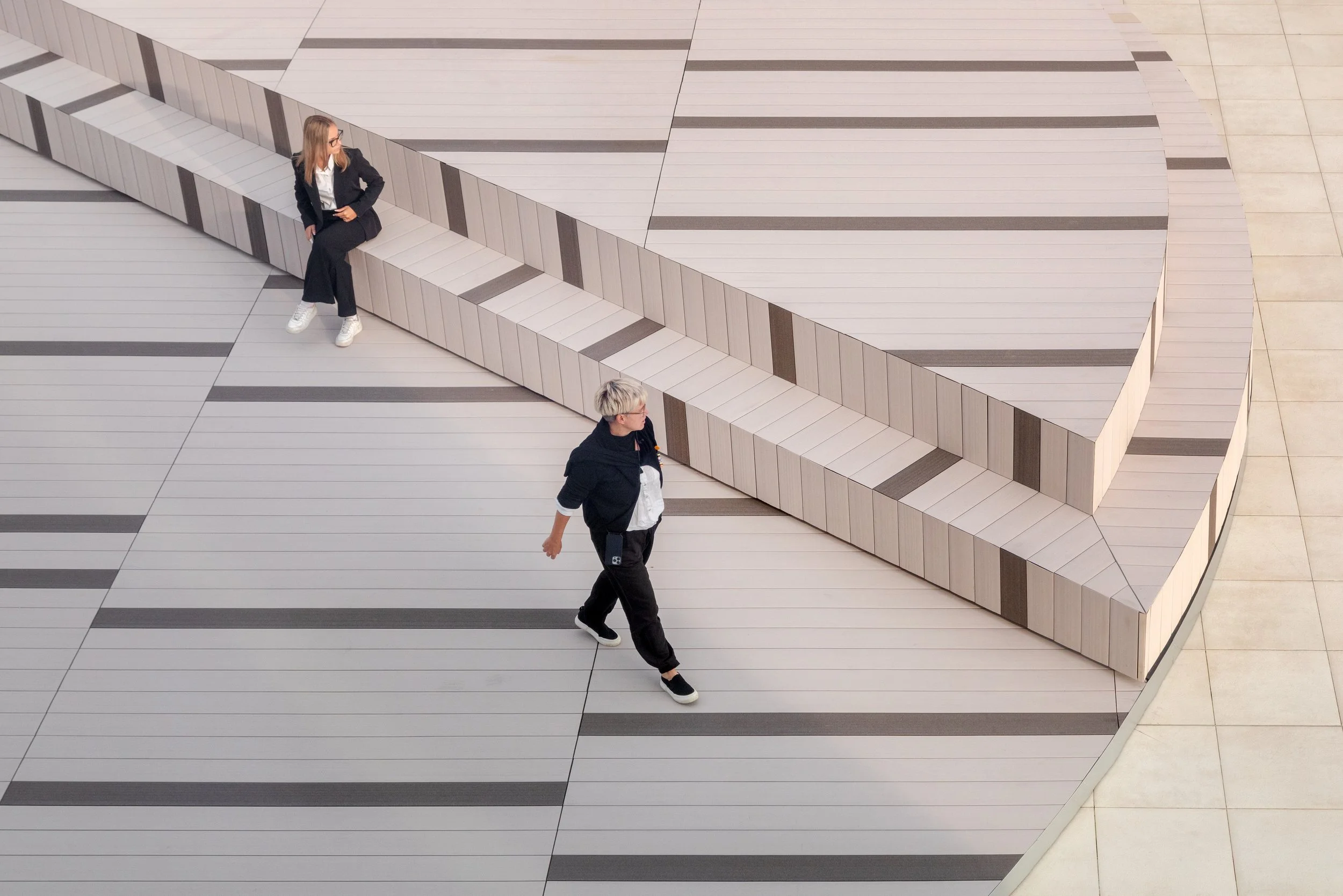The graphic pattern of the planks follows a precise sequence: a darker area in visual continuity with the asphalt gradually gives way to alternating light and dark tones, echoing the nearby motorway. A symbol of speed becomes, here, a rhythm of human relations - the fast lane translated into a place to slow down.