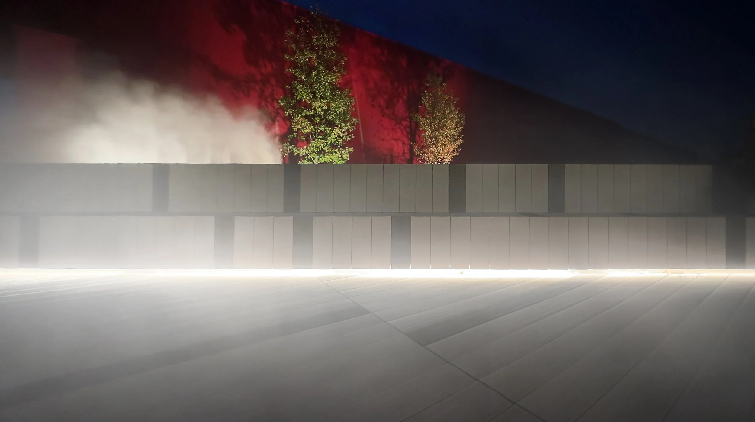 An integrated LED lighting system, placed beneath the seating tiers and around the vapour installation, lets the square transform after dusk. Lines of light accentuate edges, reveal section changes, and underline the atmospheric presence of the vapour cloud, turning the piazza into an evening device of glow and mist.