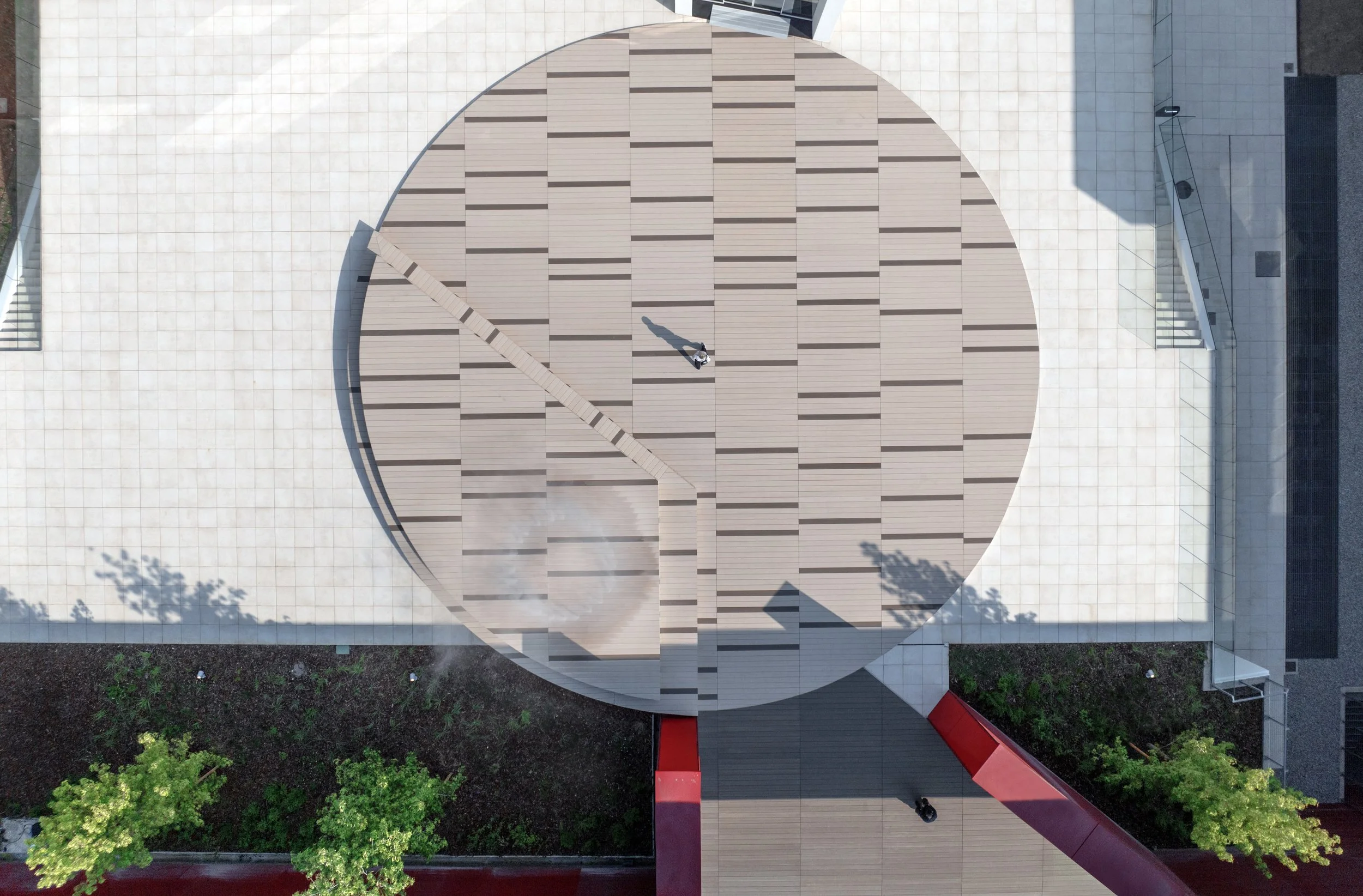 Within this ring, a circular space is crossed by a single diagonal that originates from the main entrance walls. As it cuts through the deck, this diagonal folds into a double-tiered seating system capable of hosting up to 90 people - a micro-amphitheatre that can support informal meetings, talks, and temporary events.